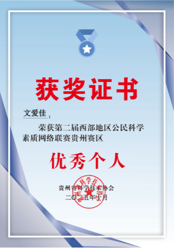 近日,第二届西部地区公民科学素质网络联赛贵州赛区的获奖名单正式揭晓。我院科学教育专业的五名学生凭借扎实的科学素养,在激烈的竞争中脱颖而出,荣获贵州赛区优秀个人称号。本次大赛由贵州省科学技术协会联合西部其他11个省(市、区)科学技术协会共同主办,于2025年5月30日正式开启答题通道。截至8月30日20:00,全省共有8108人参与答题,累计答题次数达135124次,最终评选出50名优秀个人。