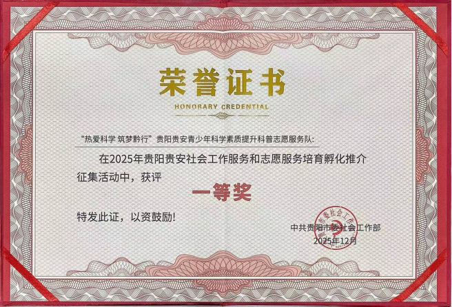 我校申报的“热爱科学 筑梦黔行”科普志愿服务项目,在共青团贵阳学院委员会及材料科学与工程学院团总支的悉心关怀与鼎力支持下,凭借扎实的专业基础、创新的服务模式、显著的社会成效以及高度的可复制推广价值,获得了评审专家的高度认可,最终斩获一等奖。这一成绩不仅是对团队专业能力的充分肯定,更是我校社会工作服务与志愿服务育人成果的重要体现。